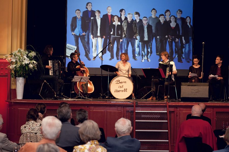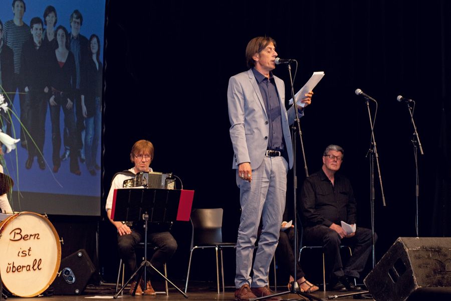 Die nachfolgende knappe Stunde des Abends überzeugte das gesamte anwesende Publikum sogleich davon, dass die Kulturkommission mit den auftretenden Künstlerinnen und Künstlern ein grossartige Wahl getroffen hatte: «Bern ist überall» zog das Publikum vom ersten Ton an in ihren Bann. Das Ensemble wird denn auch treffend als erste Band der Schweizer Literaturgeschichte tituliert. Dafür sorgt das ausgebuffte Quartett mit Adi Blum, Christian Brantschen, Michael Pfeuti und Maru Rieben an zwei Akkordeons, Cello und Schlagzeug, welches die expressiven Lesungen der elf Literatinnen und Literaten erst zum theatralischen Erlebnis macht. Und die sich überstürzenden Reden, Ausbrüche, Litaneien und Nörgeleien, auf berndeutsch, französisch oder in anverwandten Dialekten wuchsen sich zu einer bodenständigen Sprachsymphonie aus. Das stündige Set erntete stürmischen Applaus.