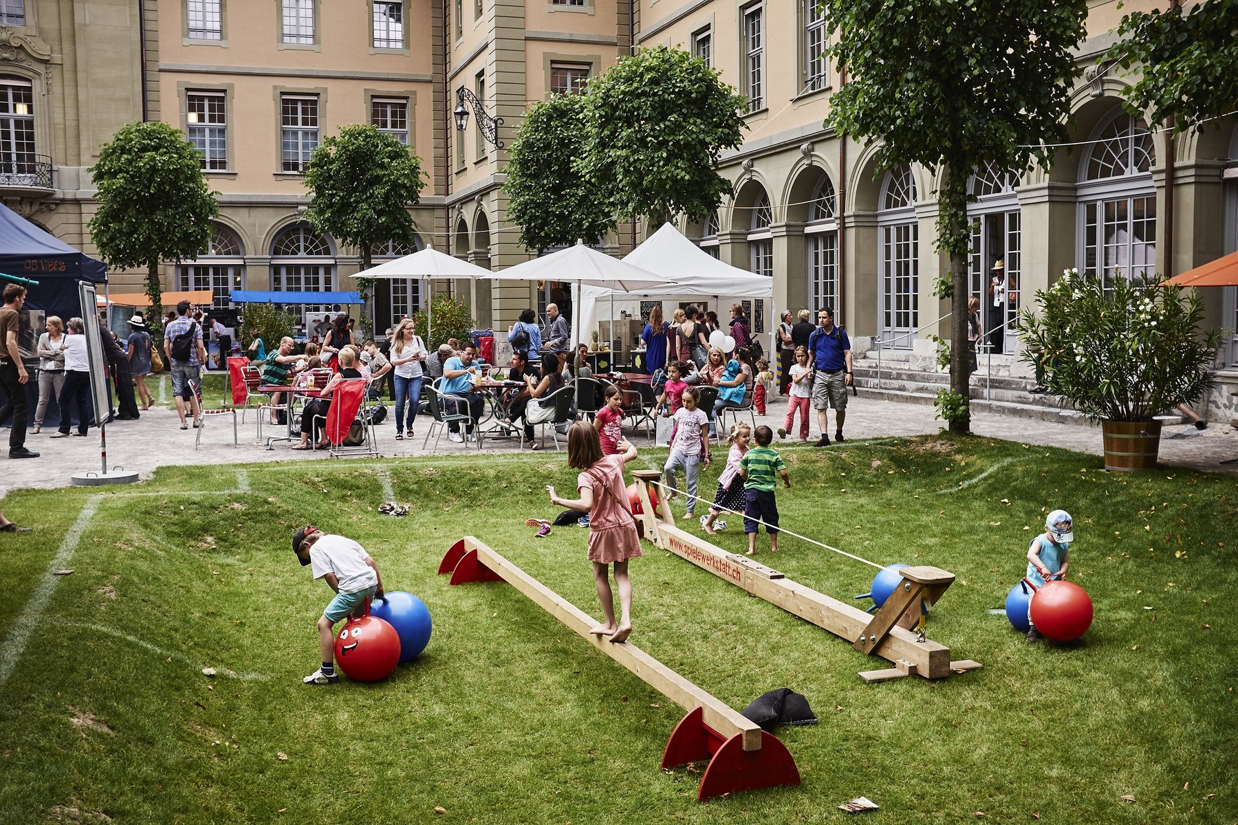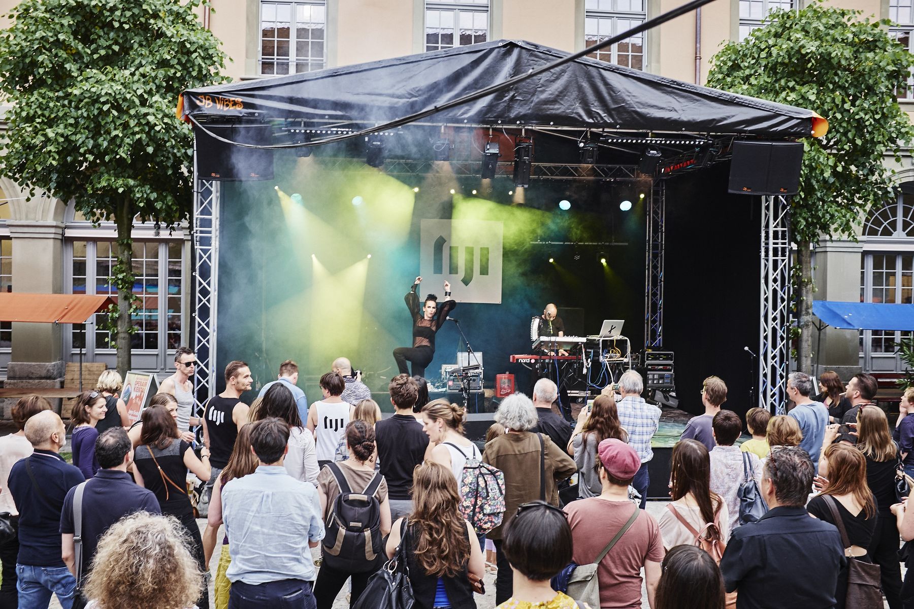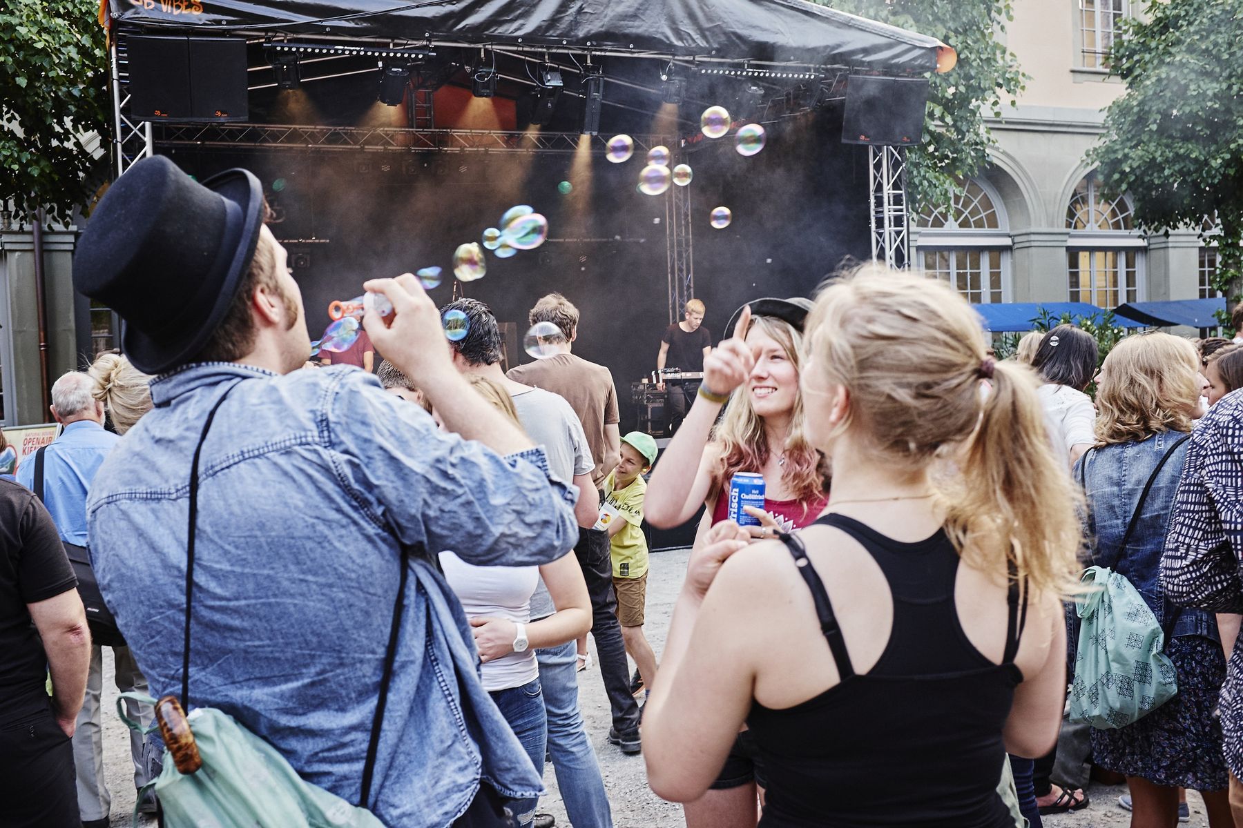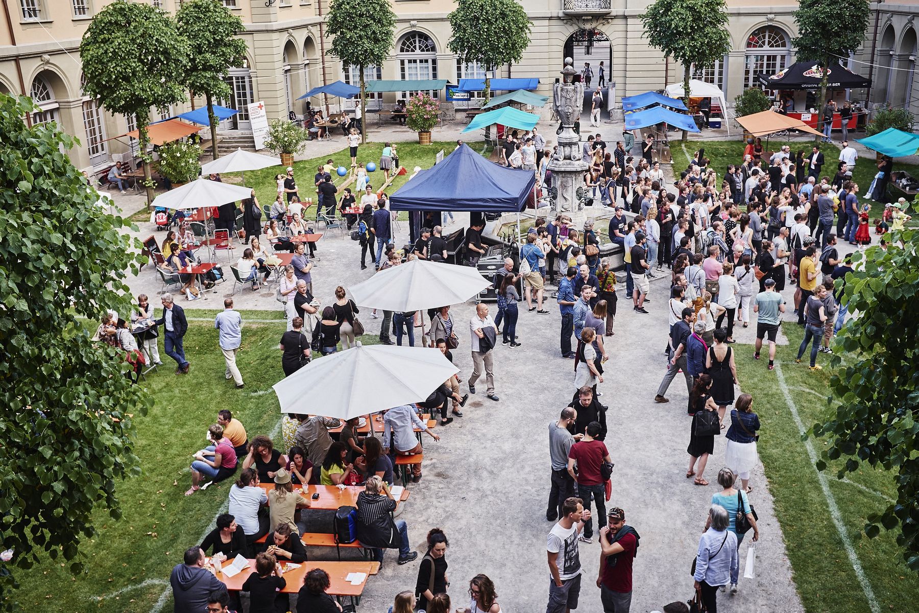 Doch auch kulinarisch kam das Publikum nicht zu kurz. So trumpfte der sympathische Stand von «jolimont» aus Wattenwil auf mit «gfronigem» Bio Joghurt sowie leckeren Crêpes. Rassige Akzente setzte am Wochenende die fahrende Küche «La Ribollita», welche aus einem Vespacar leckere Gemüseeintöpfe und -suppen anbot, derweil das Restaurant «toi et moi» mit seinem Stand im Hof alle anderen Gourmets verwöhnte. Am Freitag startete die kultige Band Fiji! den Konzertreigen auf der Hofbühne und erntete begeisterte Fanreaktionen für ihren trashigen Electrosound. Gleichzeitig machte der Nachwuchs im Checkpoint mit seinen Konzerten gehörig auf sich aufmerksam. Die Bühne gehörte dort diversen Schülerbands. Insbesondere die Grossformation «Hakuna Matata» punktete beim Publikum mit viel Charme, und zuletzt eroberten «L&B» die Herzen mit poppigem Swing. Spätnachts heizten dann «Eldorado FM» mit den Überraschungsgästen «Lo & Leduc» den proppenvollen Spittelinnenhof tüchtig auf. Darauf galt es abzutauchen in die DJ’s Lounge im Kellergewölbe des zweiten Untergeschosses, wo elektronische Musik zu stimmiger Bar-Atmosphäre pulsierte. Die Lounge war auch in der Folgenacht der Renner. Der Samstag startete mit dem bunten Spittelmärit, wo unter anderem Trouvaillen aus dem Burgerspital angeboten wurden. Ein wahrer Höhepunkt war am zweiten Konzerttag der Gig von «Traktorkestar» mit pfeffrigem Balkansound. Zuletzt herrschte kochendheisse Stimmung, welcher nicht einmal die spätnächtlichen Regenschauer etwas anhaben konnten: Nach dem Chilloutset von «2 for Soul» kam es mit badenden Fans im Spittelbrunnen zu Szenen wie aus Fellinis «Dolce Vita»!