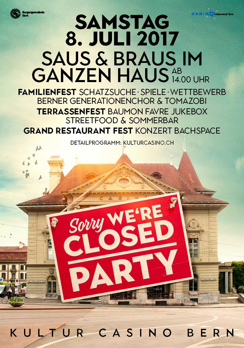 Am Samstag, 8. Juli 2017 bietet sich nun zum letzten Mal die Gelegenheit, das Kultur Casino in seiner heutigen Form zu besuchen. Das Fest beginnt bereits am Nachmittag mit einem Familienprogramm, Streetfood und einem Informationsstand zum Umbauprojekt. Ab 17 Uhr treten der Berner GenerationenChor und die Berner Guerilla-Troubadouren Tomazobi im Grossen Saal auf. Auf der Terrasse sorgt ab 18 Uhr das Duo Baumon Favre mit ihrer Jukebox für entspannten Sound und um 21 Uhr interpretieren bachSpace im Restaurant die Werke von J.S. Bach akustisch und elektronisch neu.