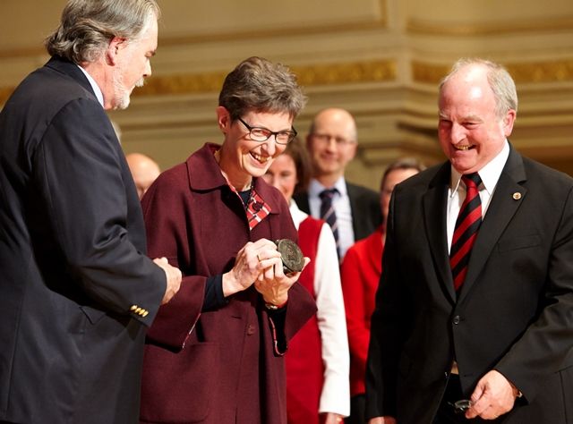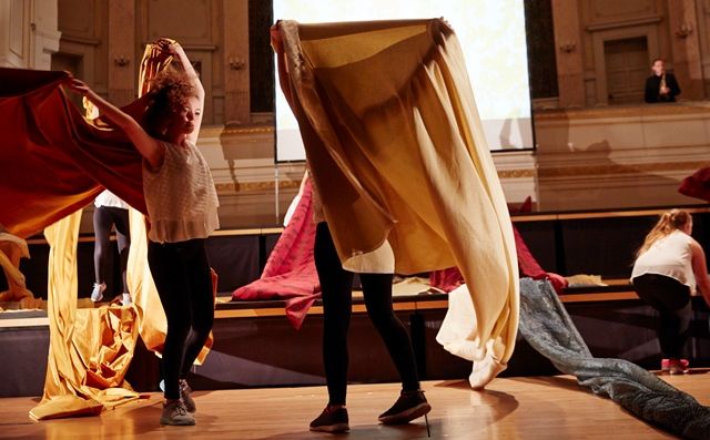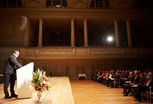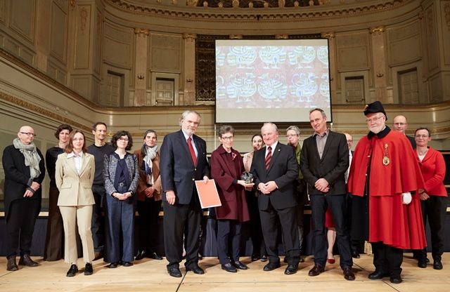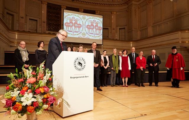 Die Kulturpreisverleihung fand dieses Jahr im grossen Saal des Kultur Casinos Bern statt. Einen ersten, subtilen Hinweis auf die diesjährige, zunächst geheim gehaltene Preisträgerin lieferte die Einladungskarte mit dem Motiv im Reliefdruck eines an einem Fischteich angelnden Engels. Gleich zu Beginn des Abends nahm die Kindertanzgruppe «Bühnentiger» unter Leitung von Karin Hermes die grosse Bühne in Beschlag und zeigte einen ersten Ausschnitt aus ihrem Stück «Das Geheimnis der beiden Teppichweber», dezent begleitet von Saxofonklängen von Till Grünewald. Danach hiess Burgergemeindepräsident Rolf Dähler die zahlreich erschienen Gäste willkommen. Der Präsident der Kulturkommission, Georg Pulver, gab anschliessend die diesjährige Preisträgerin bekannt. Anschliessend hielt Jakob Messerli, Direktor des Bernischen Historischen Museums, eine sehr persönliche Laudatio auf die Abegg- Stiftung. Ausgehend von einer Bergwanderung im Piemont, welche nach Perosa führte, schilderte er die Begegnung mit dem Namen der Zürcher Textilproduzenten-Familie Abegg auf einer Inschrift an einer einstigen Produktionsstätte. Nach der Würdigung der weitsichtigen Stiftungsgründung endete die Rede mit der Betonung der fachlichen Verbundenheit zwischen der Abegg-Stiftung und dem Bernischen Historischen Museum im Bereich der textilen Schätze und deren Erforschung. Nach der offiziellen Preisübergabe an das fast vollständig auf der Bühne präsente, grosse Abegg-Team, wandten sich deren Direktorin Regula Schorta und Stiftungs-Präsident Dominik Keller mit bewegten Dankesreden ans Publikum. Der Abend klang bei einem lebhaften Apéro Riche aus.