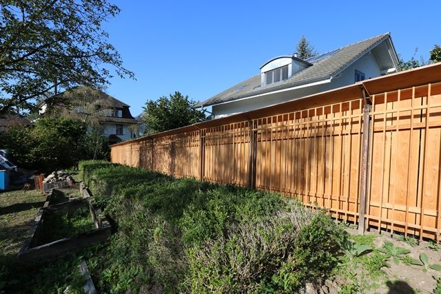 Der grosse Gartenbereich war ursprünglich unterteilt in einen Gesellschafts- und einen Nutzgarten für Gemüse und Kräuter. Die jetzige Instandstellung des in den letzten Jahrzehnten völlig verwilderten Gartens folgte dem historischen Konzept – in moderner Interpretation. Der frühere Nutzgarten hinter dem Haus wurde neu für beide Parteien angelegt, die hölzerne Spalierwand zur Nachbarparzelle originalgetreu erstellt und bepflanzt. Der historische Gesellschaftsgarten bietet nun beiden Wohnparteien einen Gemeinschaftsteil, hier steht auch der alte Schalenbrunnen. Weiter wurden wohnungsbezogene, private Aufenthaltsplätze realisiert.