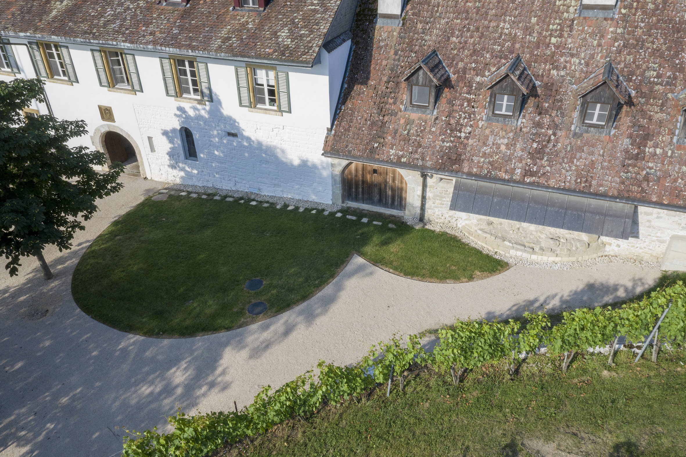 Von Metallbändern eingefasste Rasenflächen zeigen die Umrisse der eingestürzten Klosterkirche an (Foto Philippe Joner, archäolog.Dienst des Kantons Bern)