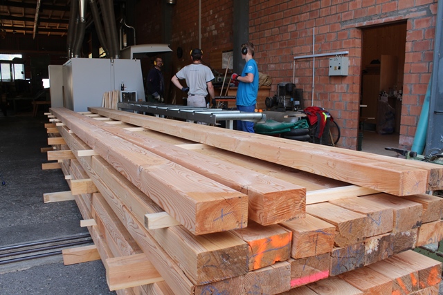 Holzplanken nach dem Abkanten, bevor sie zur Trocknung gelagert werden (im Hintergrund Abkantungsmaschine)