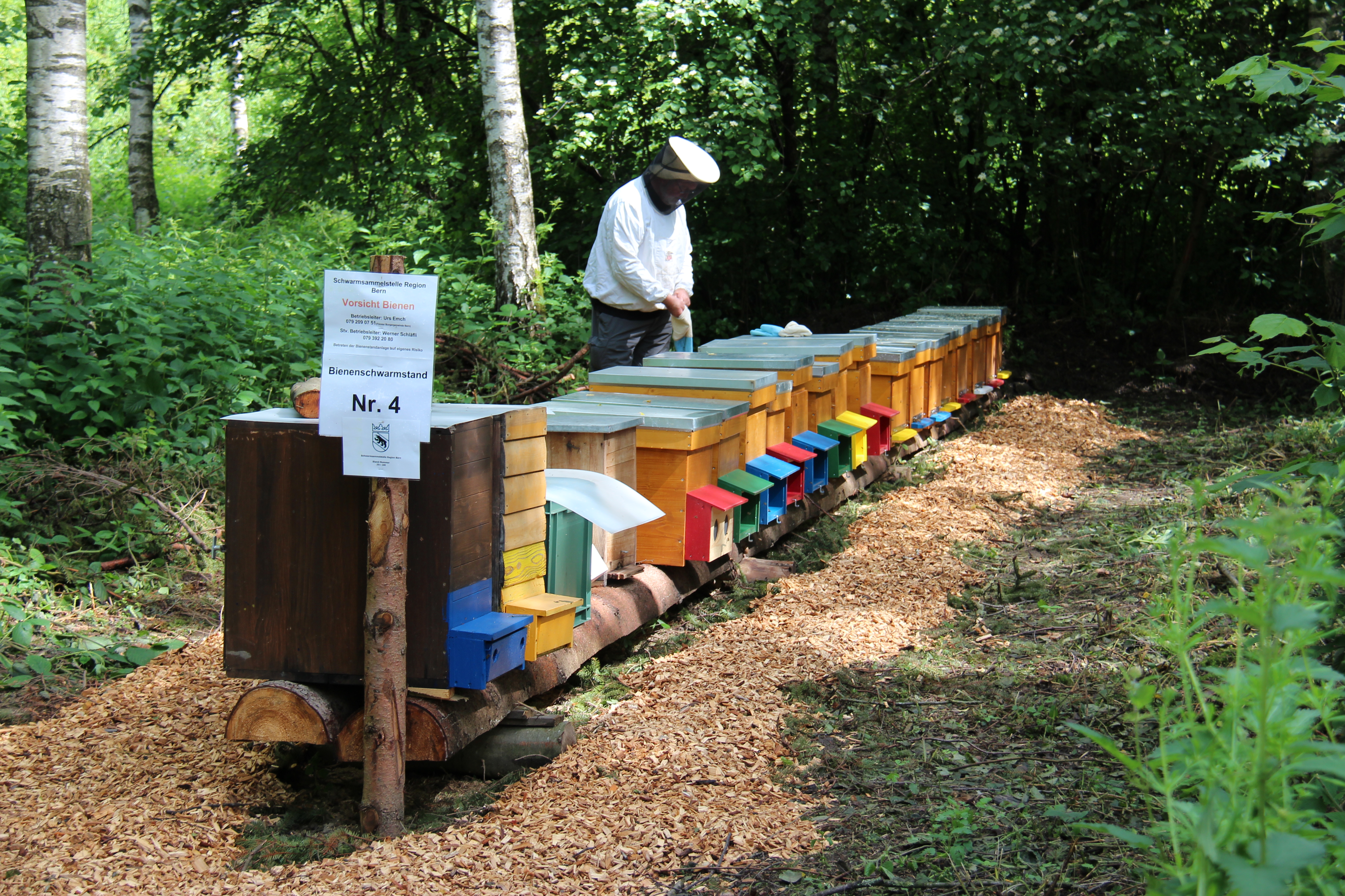 Der Imker holt in Arbeitsmontur ein Volk auf Station Vier hervor.