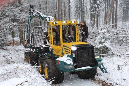 Betriebsleiter Stefan Flückiger im technischen Gespräch mit einem Mitarbeiter auf dem Forwarder