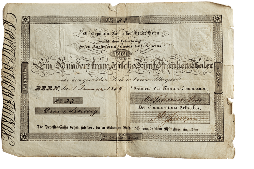 Als der englische Aktienmarkt 1825 zusammenbrach, wurde die Deposito-Cassa der Stadt Bern gegründet. Ihr Zweck: die Kassenvorräte der Stadt sicher zu verwalten. Bereits im Gründungsjahr gab die spätere DC Bank banknotenähnliche Papiere aus und gilt somit als erste Notenbank der Schweiz. Diese Papiere hatten einen Nennwert von 100 französischen «Fünf-Franken-Thalern» – ein für die Zeit hoher Betrag, der sie als alltägliches Zahlungsmittel ungeeignet machte.